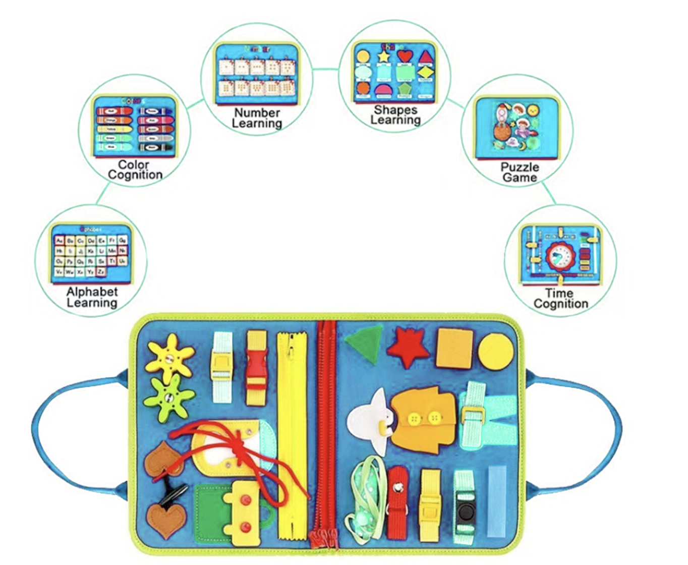 Help your little one to develop essential skills by igniting their curiosity with our engaging busy book. Your child can play with dozens of manipulative features to keep the little hands busy.