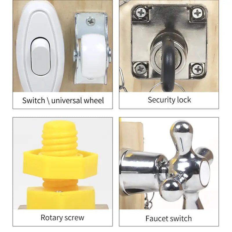 - Comprehensive Learning: The cube's features include a fingertip spiral, spring latch, one-way switch, universal wheel, faucet switch, and rotating screw, promoting cognitive, visual, auditory, and tactile development.